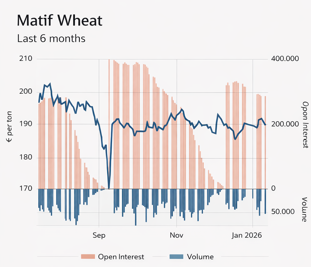جاء تقرير القمح بدوره ذا طابع ضاغط على الأسعار. فقد ارتفع إجمالي المعروض العالمي (المخزون الافتتاحي + الإنتاج) إلى 1,102.2 مليون طن، بزيادة 4.3 مليون طن، مدفوعًا أساسًا بارتفاع الإنتاج في الأرجنتين وروسيا.