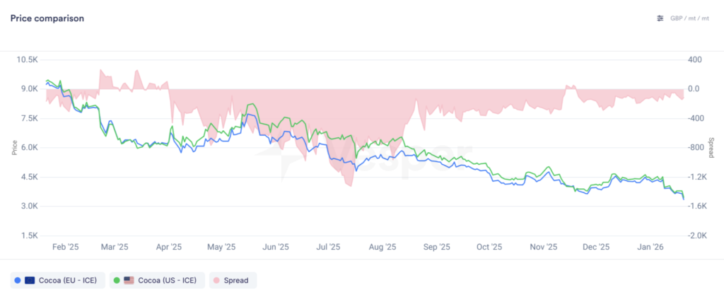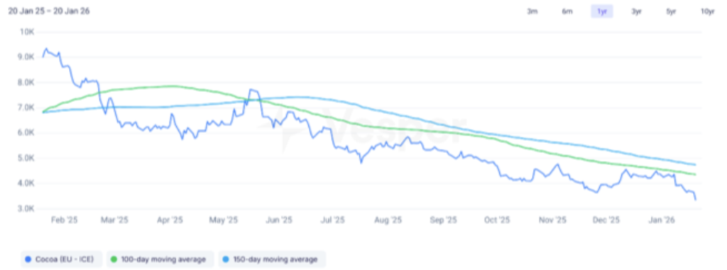 - بيئة كلية مضطربة: رغم تراجع الدولار وارتفاع الذهب، لم تتحول هذه العوامل إلى دعم واضح للكاكاو، مقارنة بسلع مالية أخرى أكثر حساسية للعناوين الجيوسياسية.
