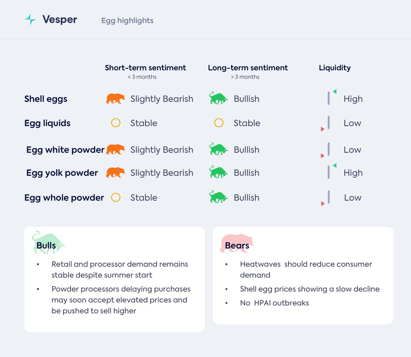 - يتوافق الطلب على التجزئة مع التوقعات الموسمية. يحافظ مصنعو البيض السائل على إنتاج مستقر.