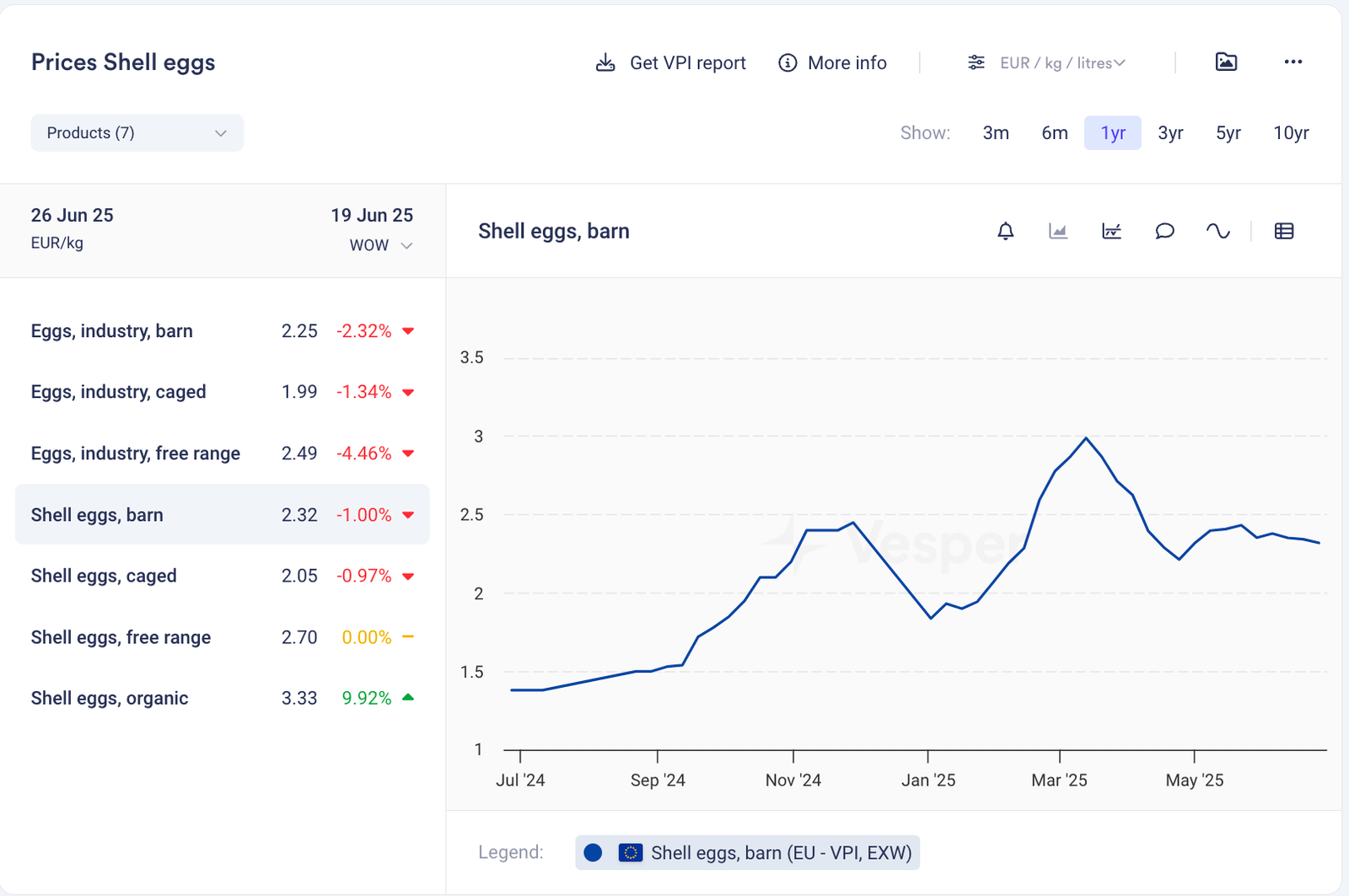 | صفار البيض السائل، حظيرة | 5.1% ↓ | €7.25 | €6.88 |