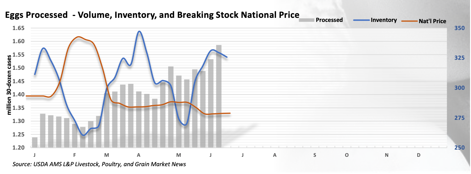 - لا يزال إنتاج مسحوق البيض منخفضًا حيث يؤخر المصنعون شراء البيض تحسبًا لانخفاض الأسعار. ومع ذلك، مع وجود تحركات طفيفة في الأسعار طوال شهر يونيو، قد يضطر الكثيرون قريبًا إلى قبول مستويات الأسعار الحالية وزيادة الإنتاج – مما قد يؤدي إلى رفع أسعار البودرة.