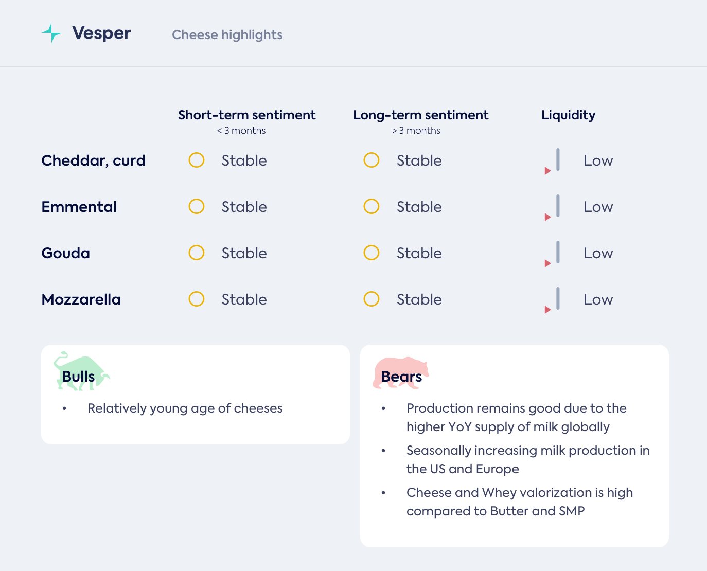 - لا يزال الطلب مستقرًا حاليًا في جميع المناطق، لكن المشترين لا يبدون عجلة لتأمين الكثير من الجبن للربع الثاني بالفعل، وبدلاً من ذلك ينتظرون لفترة أطول قليلاً