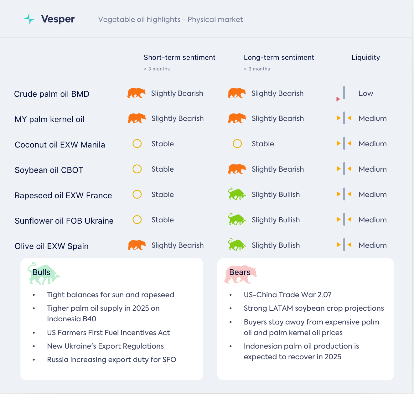 ارتفعت أسعار زيت النخيل بسبب مخاوف الإمدادات والتصريح الحازم لإندونيسيا بشأن تطبيق برنامج الوقود الحيوي B40. لا يستفيد زيت الصويا من ارتفاع أسعار زيت النخيل حيث زادت العديد من الوكالات البرازيلية من توقعاتها لمحصول فول الصويا للعام المقبل، مع استمرار هطول الأمطار الذي يفيد المحصول. لا يزال من الممكن أن يشعر مركب بذور اللفت/الكانولا بتأثير إعلان ترامب بأنه يمكنه فرض ضرائب على السلع الكندية بنسبة 25٪. انخفضت أسعار زيت عباد الشمس.