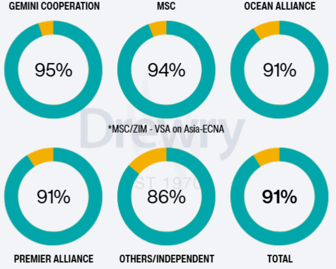 - تتركز معظم عمليات الإلغاء على طرق آسيا وأمريكا (50٪، بزيادة 2٪)، تليها آسيا وأوروبا / البحر الأبيض المتوسط (19٪، بانخفاض 6٪) والتي زادت مقارنة بالأسبوع الماضي وأخيراً أوروبا وأمريكا (31٪، بزيادة 4٪).