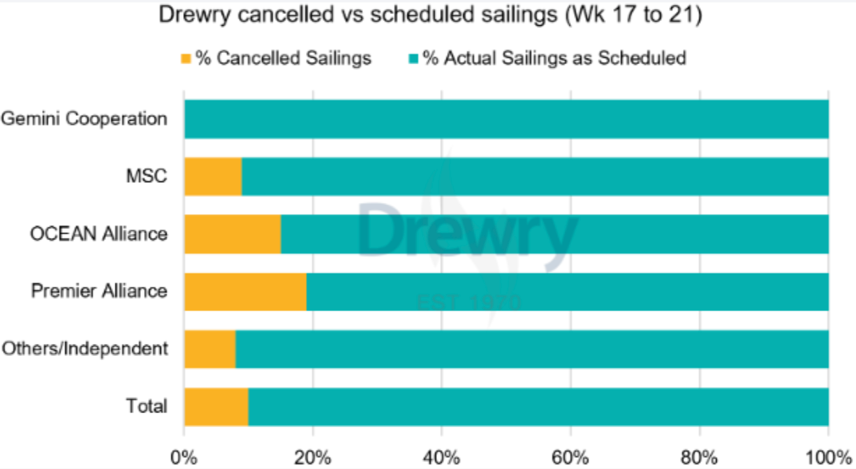 من المتوقع أن تنخفض حجوزات الشحن من الصين بنسبة 30-60٪ في الأسابيع الثلاثة المقبلة، وقد تنخفض الحجوزات من بقية آسيا بنسبة 10-20٪. مع اقتراب عيد العمال في العديد من البلدان، من المتوقع أن تنخفض الطلبات أكثر.