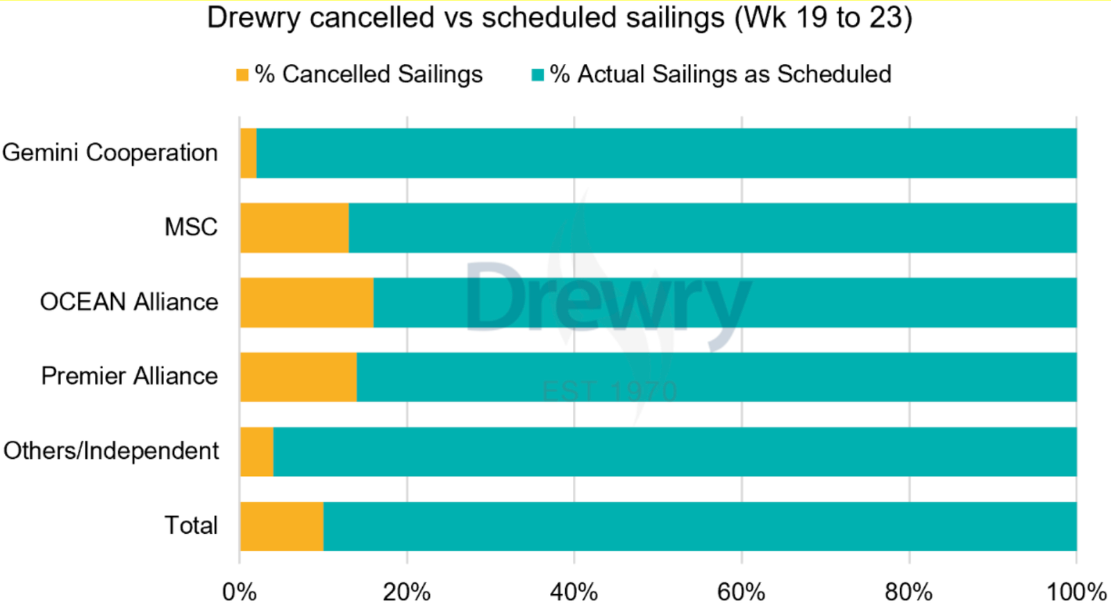 بين الأسبوعين 19 و 23، تم إلغاء 10٪ من عمليات الإبحار على الطرق العالمية الرئيسية، مع تأثير الغالبية على الشحنات إلى الولايات المتحدة.