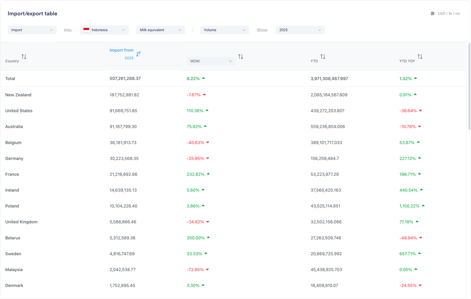 إن النظر إلى واردات ما يعادل الحليب يروي القصة (يحسب ما يعادل الحليب حجم الحليب اللازم لإنتاج سلع الألبان المختلفة، مما يوفر صورة كاملة):