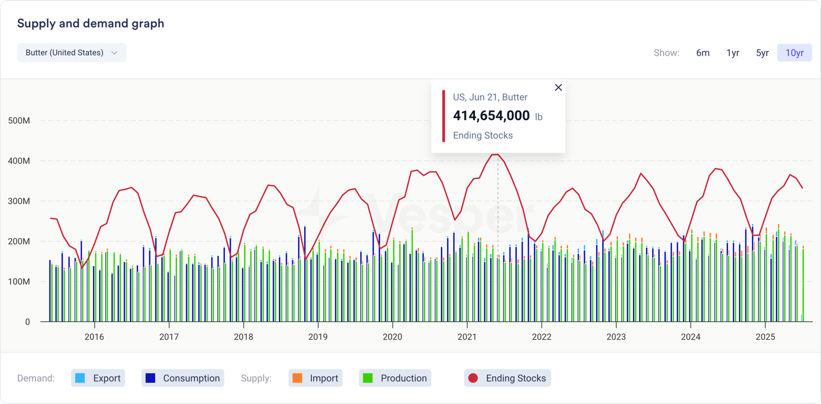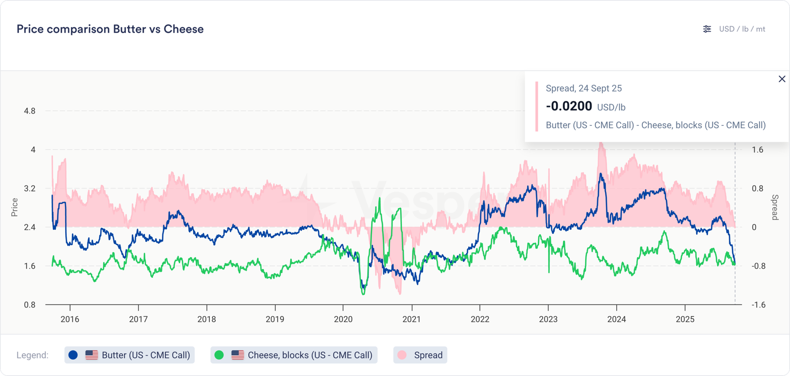 نشهد الآن أيضًا ظاهرة غير عادية إلى حد ما ولكنها ليست فريدة من نوعها، حيث تتجاوز أسعار الجبن أسعار الزبدة. كانت المرة الأخيرة التي حدث فيها هذا في عامي 2020 و 2021، عندما كانت مخزونات الزبدة هي الأعلى التي رأيناها منذ عام 2015. دفع إنتاج الحليب القوي الكثير من الإنتاج نحو الزبدة بدلاً من الجبن، حيث بلغت ذروة الخبز المنزلي في سنوات كوفيد.