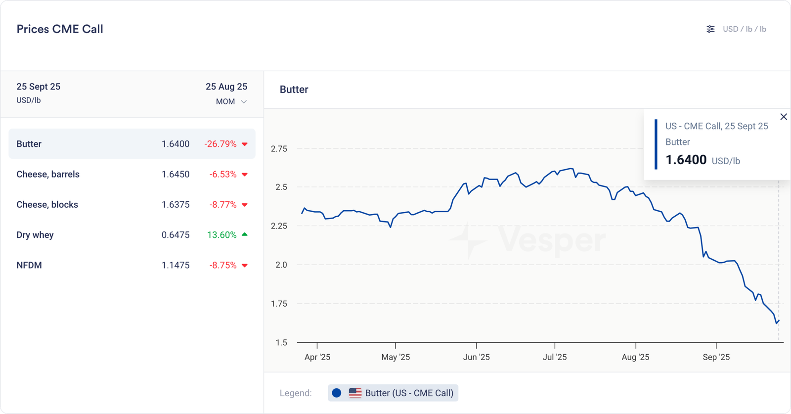 1.62 دولارًا أمريكيًا للرطل هو الحد الأدنى الجديد لهذا العام، لكن لا يبدو الأمر وكأنه سيتوقف عند هذا الحد. مع تعرض أسعار الزبدة في أوروبا الآن لضغوط كبيرة أيضًا، قد تفقد الولايات المتحدة أعمال التصدير، وهو الشيء الوحيد الذي منع أسعار الزبدة من الانخفاض في وقت سابق من العام. بالنسبة لأولئك الذين ليسوا على علم، فإن الزبدة الأمريكية ذات ملمس ولون ونسبة دهون مختلفة مقارنة بالزبدة المصنوعة في أوروبا و / أو نيوزيلندا، مما يعني عمومًا أن الأشخاص المعتادين على زبدة الاتحاد الأوروبي / نيوزيلندا لن يأخذوا سوى الزبدة الأمريكية القياسية عندما تكون بسعر مخفض.