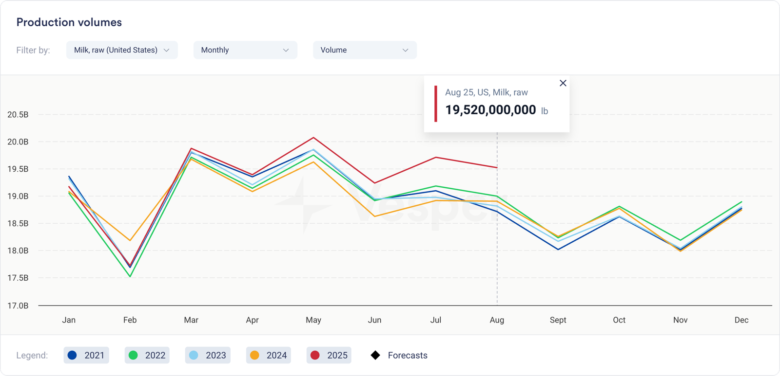 بمجرد أن يصبح هذا النشرة متكررًا جدًا، ما زلنا نريد التعليق على أرقام إنتاج الحليب لشهر أغسطس. أظهرت نموًا بنسبة 3.25٪ مقارنة بشهر أغسطس 2024، بإجمالي 19.52 مليار رطل من الحليب الخام.