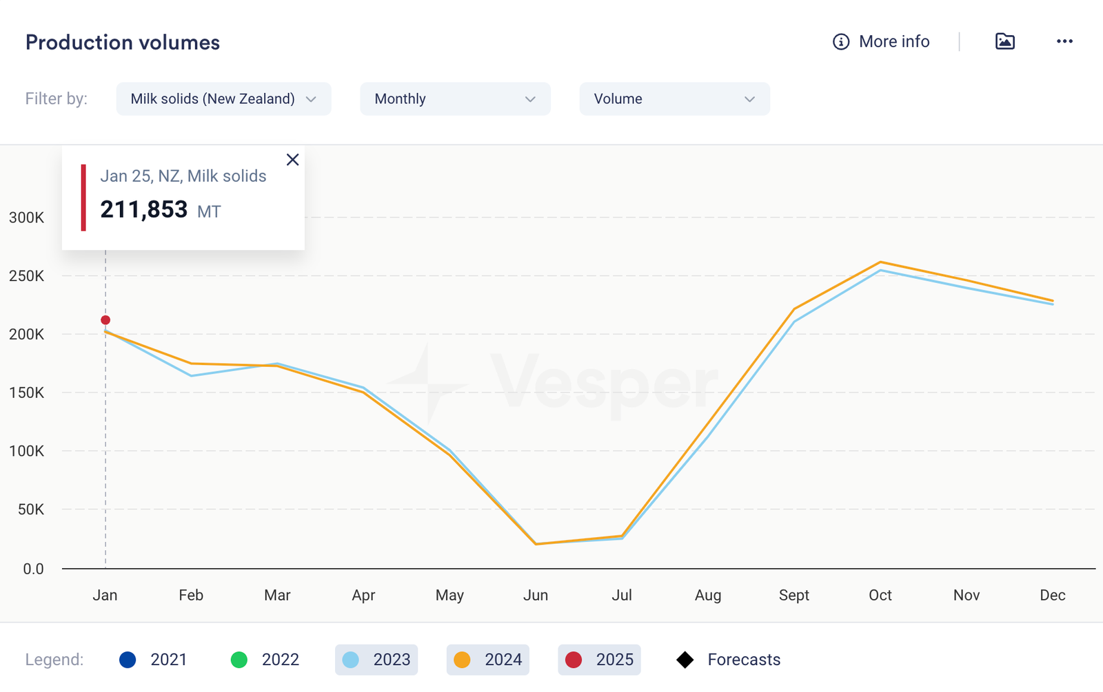 صدرت أمس أحجام إنتاج الحليب لشهر يناير لنيوزيلندا، والتي أظهرت زيادة أخرى لا تصدق مقارنة بشهر يناير 2024. على الرغم من أن إنتاج الحليب الخام ارتفع بنسبة 2.62٪ فقط، إلا أن المواد الصلبة للحليب ارتفعت بنسبة 4.99٪ مقارنة بالعام السابق.