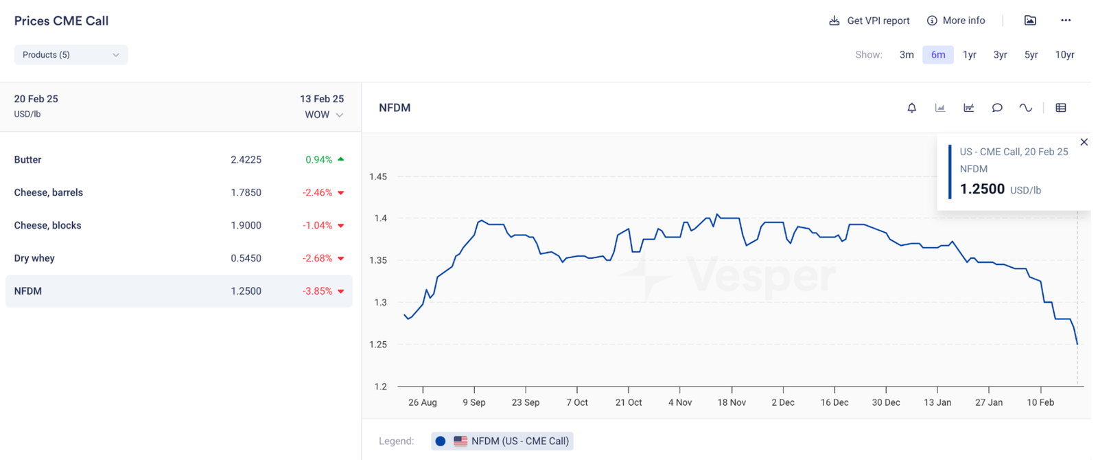 انخفضت الأسعار في بورصة شيكاغو التجارية (CME) هذا الأسبوع، مع انخفاض جميع المنتجات باستثناء الزبدة. تصدر مسحوق الحليب المجفف المشهد، مع انخفاض بنسبة -4٪ تقريبًا في أسبوع واحد فقط. بشكل عام، لا تزال الأسواق الأمريكية تكافح من أجل إيجاد دعم للأسعار حيث يتزايد إنتاج الحليب والصادرات المستقبلية غير مؤكدة، على أقل تقدير. نظرًا لأن بداية السنة التقويمية تمثل أيضًا التحول من استخدام المخزونات إلى بناء المخزون لمعظم المنتجات، فإن هذا الضغط لا يزول بسهولة.