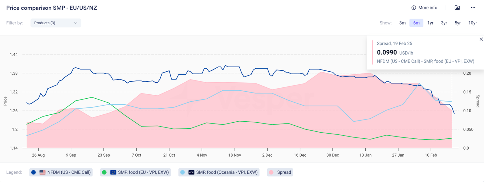 بسبب الانخفاض البالغ 0.15 دولارًا أمريكيًا للرطل الذي شهدناه منذ بداية العام، فإن الانفصال بين الأسواق الأمريكية والعالمية لمساحيق الحليب آخذ في التقلص. عاد سعر مسحوق الحليب المجفف الأمريكي أعلى من مسحوق الحليب الأوروبي بنحو 0.10 دولارًا أمريكيًا للرطل، وهو لا يزال أعلى بكثير من متوسط ​​فارق السعر بين الاثنين على مدار السنوات العشر الماضية. عادة ما يتم تداول مسحوق الحليب المجفف الأمريكي بخصم قدره 0.05 دولارًا أمريكيًا للرطل مقارنة بأوقيانوسيا وأوروبا، ولم يكن السوق الأكثر تكلفة لمدة ثمانية أشهر متتالية في السنوات العشر الماضية.