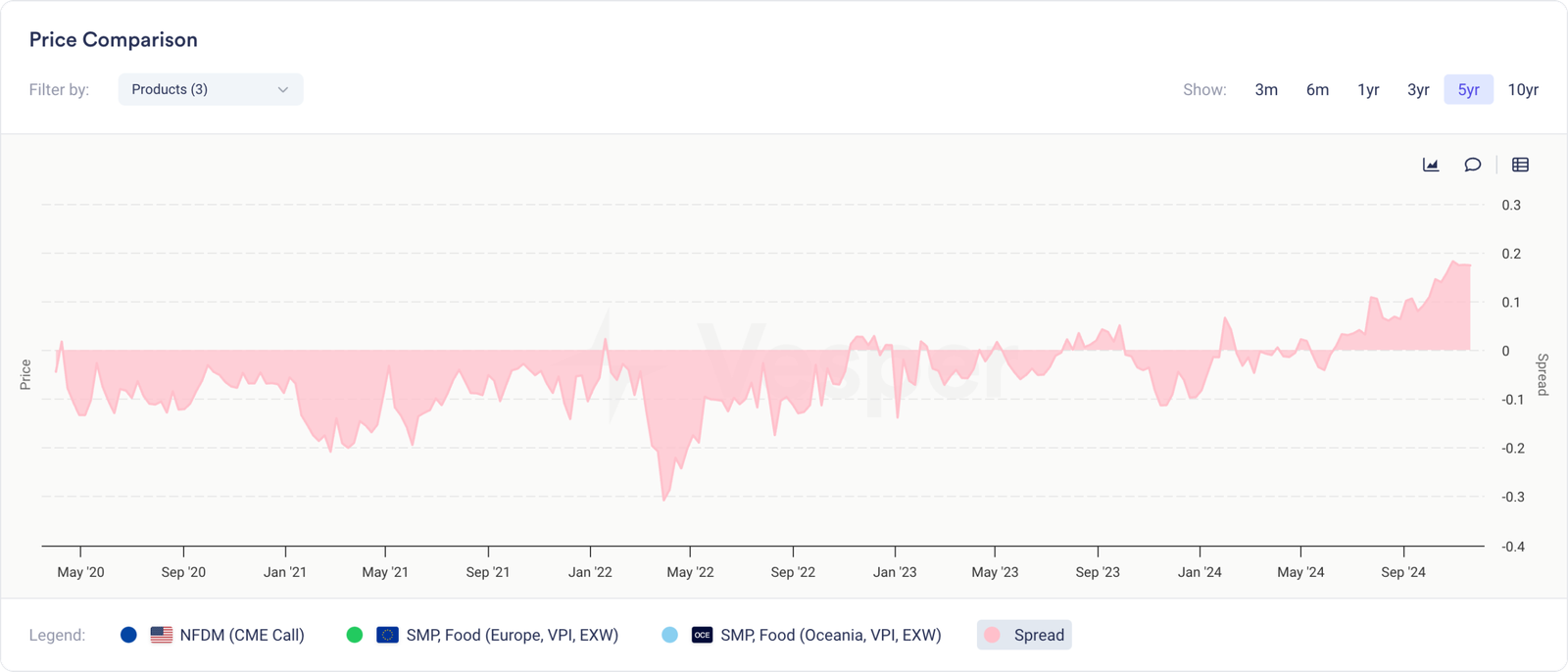 هذه ليست فقط أكبر فروق الأسعار منذ مايو 2022، ولكنها أيضًا انعكاس نادر لصالح الأسعار الأمريكية – وهي حالة شاذة تستحق التوقف عندها، حيث احتفظت SMP الأوروبية تاريخيًا بعلاوة قدرها 6 سنتات (متوسط الخمس سنوات الماضية).