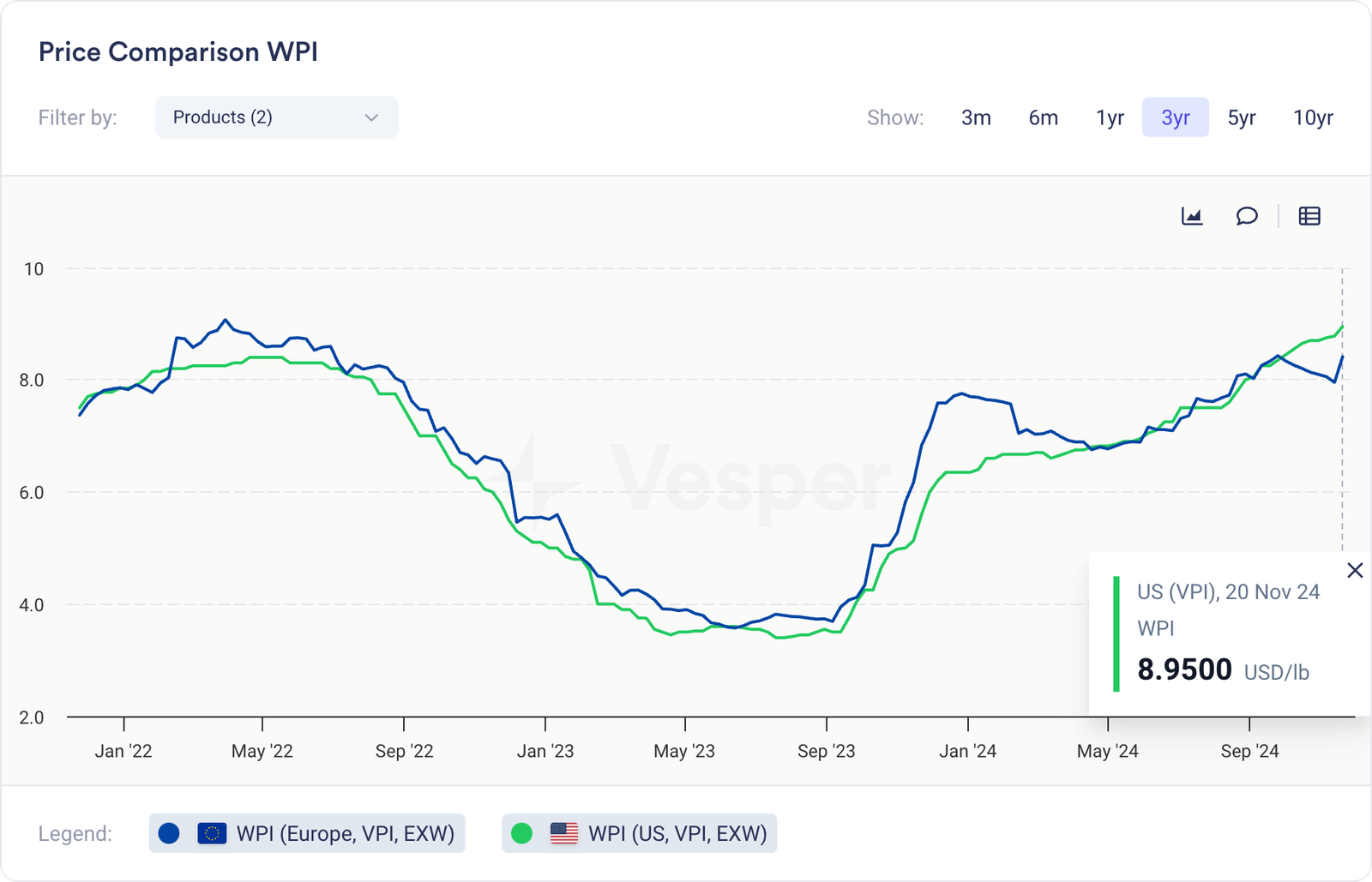 أسعار 9 دولارات أمريكية للرطل هي حقيقة جديدة؛ إنها تبدو “طبيعية” بشكل مدهش. وفقًا لقوانين العرض والطلب، يتبع العرض بمجرد زيادة الأسعار. حاليًا، نرى ذلك بالضبط. يزداد إنتاج WPI في الولايات المتحدة شهريًا وسيستمر طالما أن الأسعار تحوم حول علامة 9 دولارات أمريكية للرطل.
