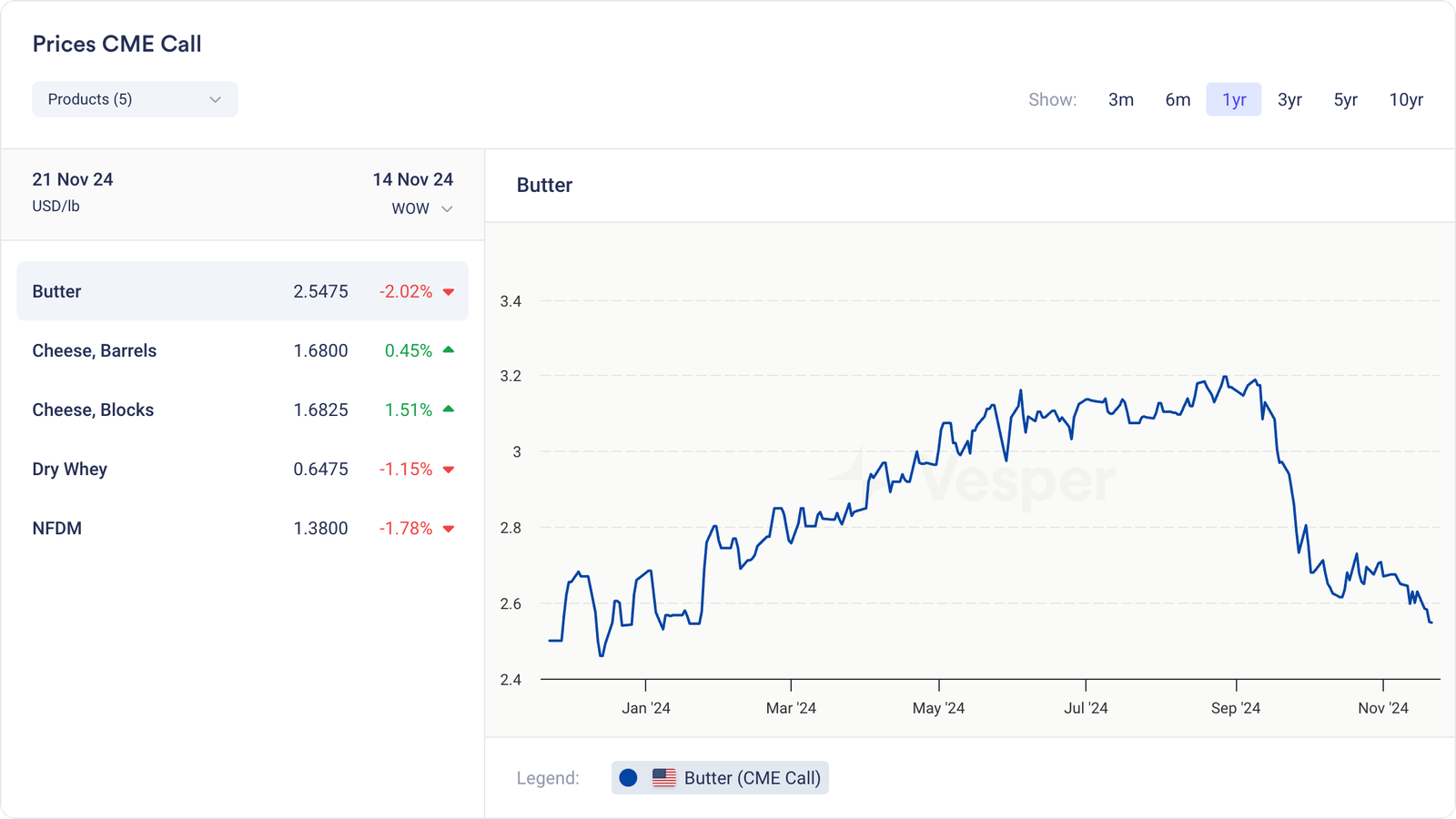 فقدت أسعار الزبدة معظم أراضيها هذا الأسبوع وتتداول عند مستويات مماثلة لما كانت عليه قبل عام. وكما ذكرنا، فإن المخزونات الجيدة هي السبب. كانت أحدث أرقام إنتاج الحليب لشهر أكتوبر، والتي جاءت بمكاسب هامشية مقارنة بعام 2023، كافية لدفع الأسعار إلى ما يقرب من 2.5 دولارًا أمريكيًا للرطل.