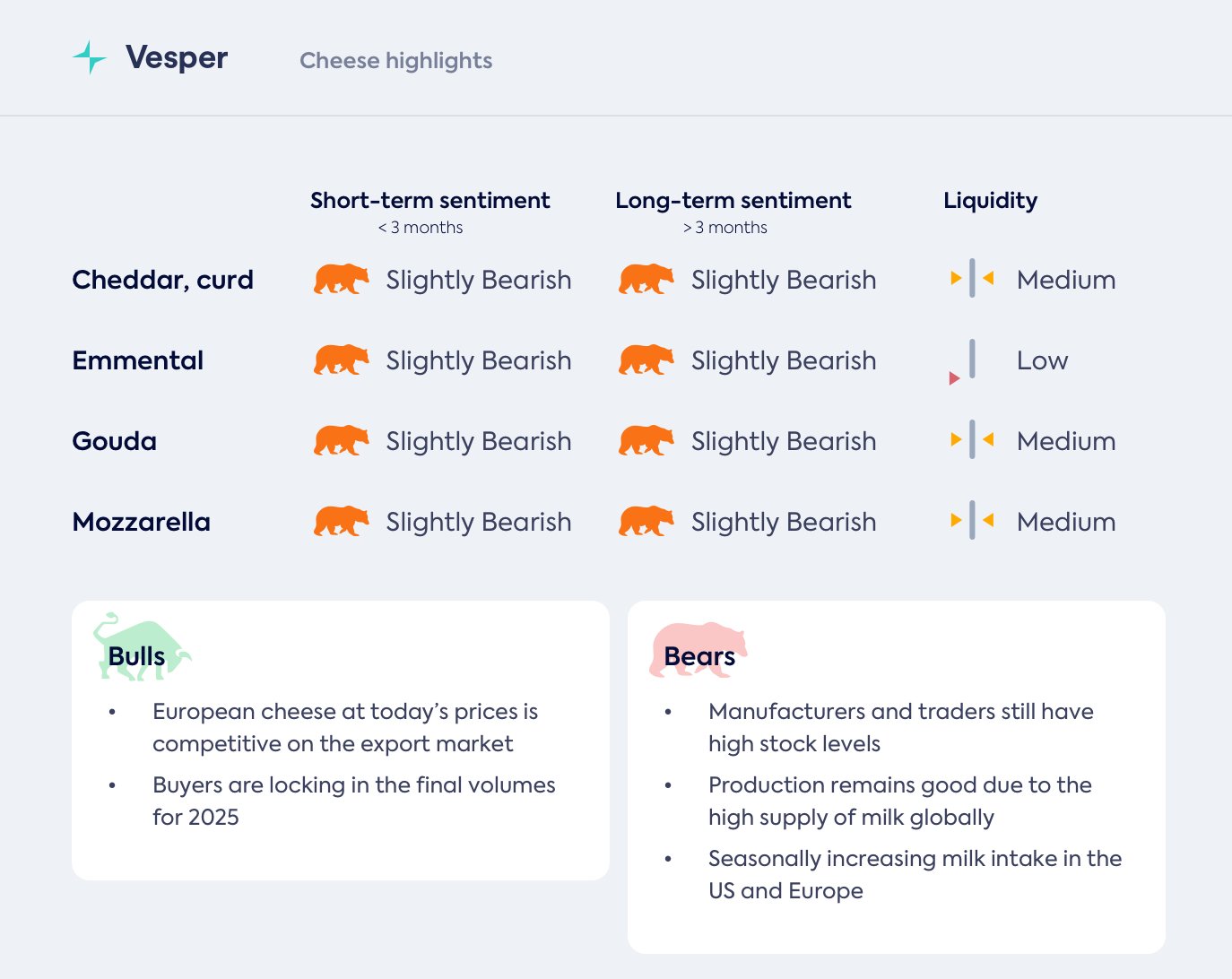 لا تزال الأسواق العالمية لجبنة شيدر أضعف قليلاً على المدى القصير والطويل بسبب العرض الأقوى والطلب الهادئ. تفضل الصادرات الآن أوروبا، لكنها ستستمر في لعب دور حاسم في أسعار جبنة شيدر العالمية عندما تحاول مناطق إنتاج متعددة العثور على مشترين في الخارج. في الوقت الحالي، يظل معظم الضغط على أسواق البيع الفوري، وإن كان أقل بكثير مما كان عليه قبل بضعة أسابيع.
