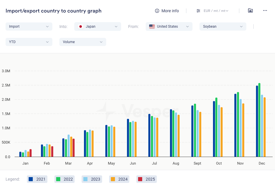 - أشارت اليابان إلى أنها قد تشتري المزيد من فول الصويا الأمريكي للمساعدة في إبرام صفقة تجارية، مما أضاف تفاؤلاً؛ ومع ذلك، تستورد اليابان فقط 3-3.5 مليون طن متري من الحبوب سنويًا، و 2-2.5 مليون طن متري تأتي بالفعل من الولايات المتحدة