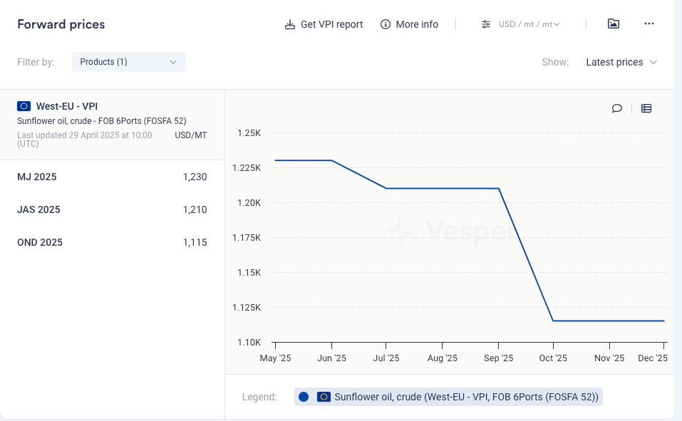 يتم تداول محصول الموسم المقبل بالفعل بسعر أقل بسبب توقعات بزيادة الزراعة. ذكرت وزارة الزراعة الأوكرانية أن مساحة زراعة عباد الشمس لعام 2025 يمكن أن تصل إلى 5.17 مليون هكتار، مقارنة بحوالي 4.8 مليون هكتار في عام 2024. وفي الوقت نفسه، تتوقع شركة الاستشارات الزراعية APK-Inform حصاد بذور عباد الشمس لعام 2025 عند 15.16 مليون طن متري، ارتفاعًا من 13.33 مليون طن في عام 2024.