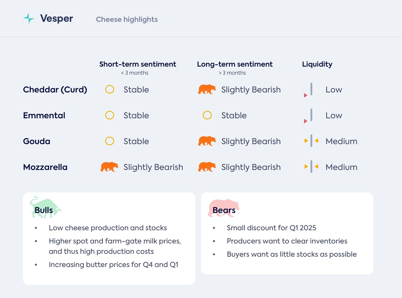 بالنسبة لسوق الجبن في الربع الرابع، الأحجام موجودة ولكن المخزونات ليست مفرطة، كما رأينا بالفعل لعدة أشهر. مع الخصم الحالي للربع الأول، يرغب العديد من البائعين في البيع قدر الإمكان قبل نهاية العام، بينما يفضل المشترون الانتظار لأطول فترة ممكنة.