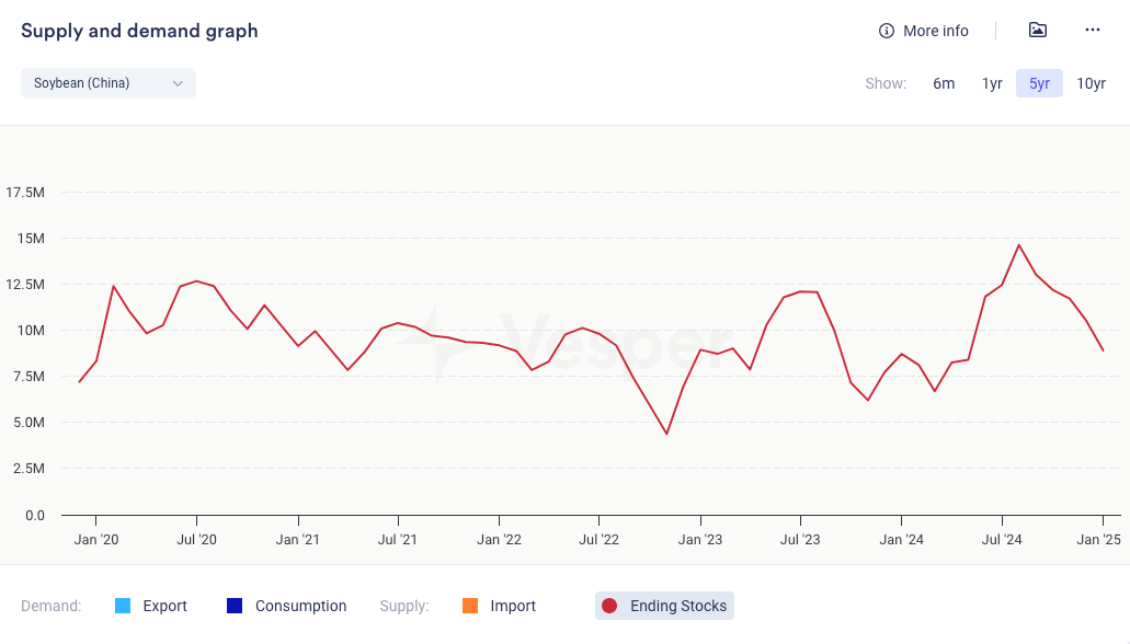 - بلغت مخزونات فول الصويا الصينية في يناير 8 ملايين طن متري، أي أقل بنسبة 6٪ من متوسط الست سنوات، في حين كانت مخزونات وجبة فول الصويا أعلى من مستويات السنوات السابقة. تذكر JCI أن الصين يمكنها الاعتماد بسهولة على البرازيل والأرجنتين للحصول على فول الصويا حيث من المتوقع أن يصل الإنتاج البرازيلي إلى مستوى قياسي مرتفع يبلغ حوالي 170 مليون طن متري
