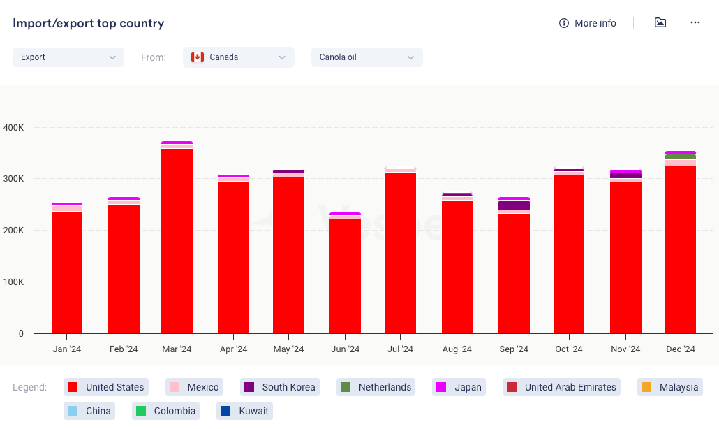 - قطاع الديزل الحيوي الأمريكي هو المنفذ الرئيسي لزيت الكانولا الكندي. بعد التعريفات الجمركية، قد يحول منتجو الديزل الحيوي الأمريكيون تركيزهم إلى زيت فول الصويا، خاصة وأن فول الصويا قد يصبح أرخص بعد الإجراءات الانتقامية الصينية