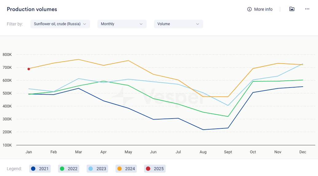 - في غضون ذلك، يبلغ إنتاج زيت عباد الشمس الروسي خلال الفترة من سبتمبر إلى يناير 3,302,069 طنًا متريًا، وهو أكثر بنسبة 26٪ مقارنة بمتوسط الأربع سنوات. روسيا مورد رئيسي للهند والصين