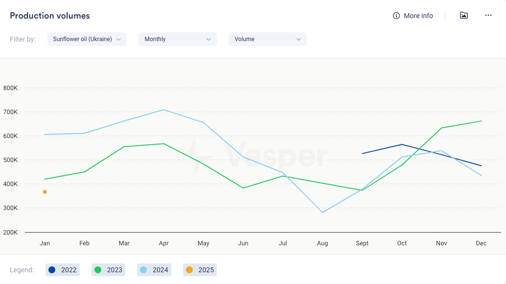 - يبلغ إنتاج زيت عباد الشمس الأوكراني خلال الفترة من سبتمبر إلى يناير 2,230,000 طن متري، وهو أقل بنسبة 15٪ مقارنة بمتوسط السنتين. أوكرانيا مورد رئيسي لأوروبا، وبالتالي تؤثر بشكل كبير على أسعار الاتحاد الأوروبي