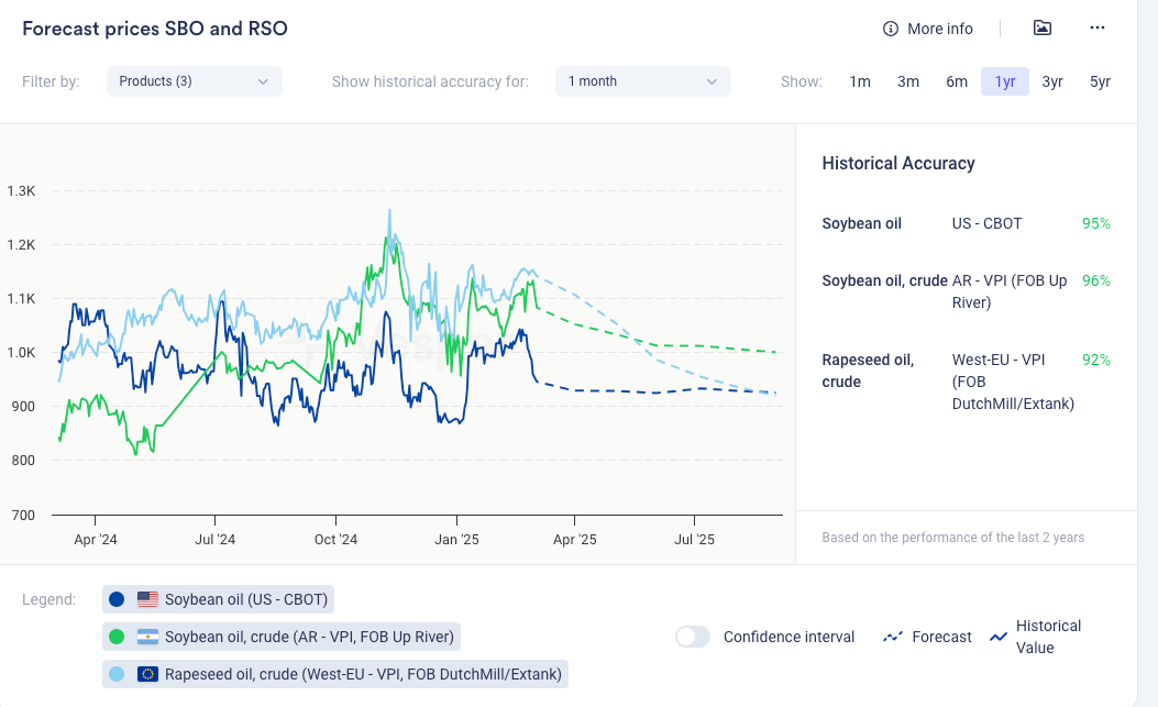 بالنظر إلى المستقبل، يمكن أن تستفيد أسعار أمريكا اللاتينية من التوترات التجارية بين الصين والولايات المتحدة، في حين من المرجح أن تعاني بورصة شيكاغو التجارية (CBOT). نتيجة لذلك، تظل النظرة طويلة الأجل هبوطية لزيت فول الصويا في بورصة شيكاغو التجارية (CBOT) ولكنها مستقرة لزيت فول الصويا الأرجنتيني. تشير Oilworld أيضًا إلى أن هناك مجالًا للنمو في زيت فول الصويا (يفترض زيت فول الصويا الخام في الأرجنتين؟).