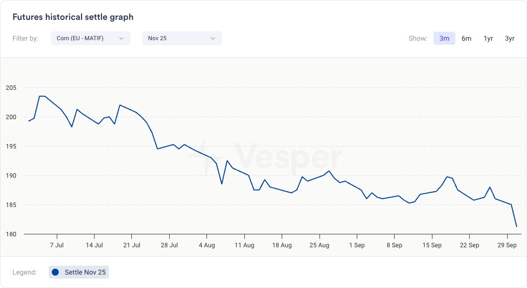 • انخفضت الذرة في يورونكست بمقدار 5 يورو/طن إلى 181 يورو/طن