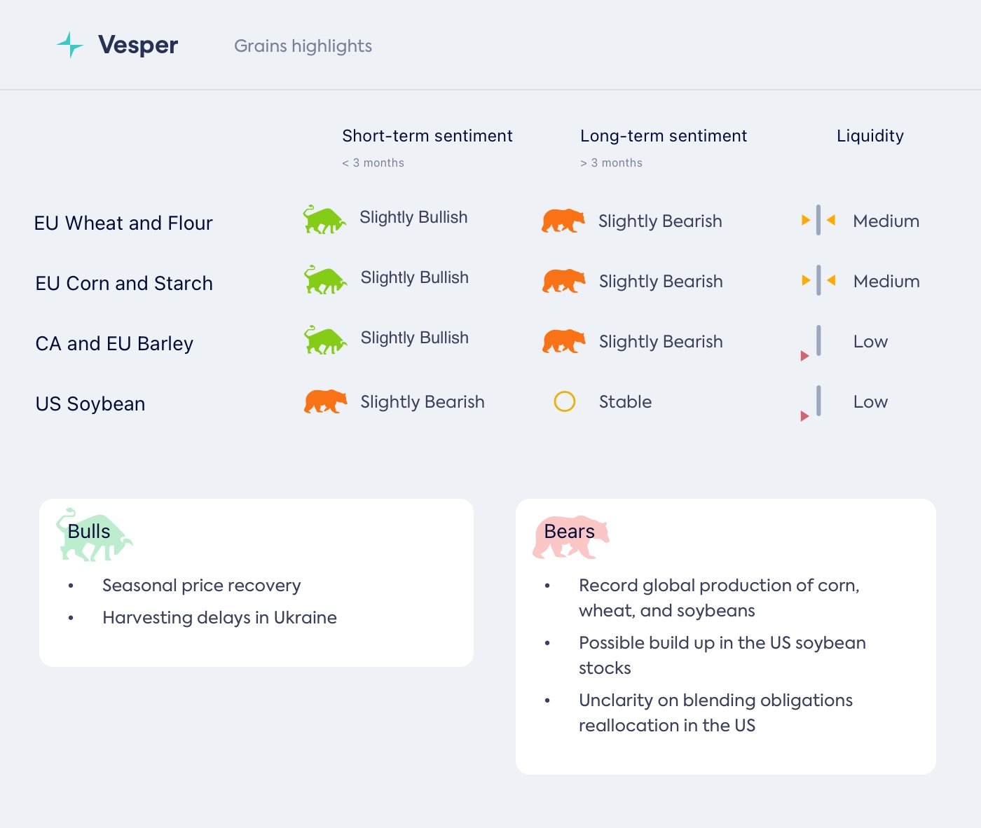 • قد يظهر الجانب الإيجابي الموسمي نحو ديسمبر، لكن إنتاج القمح والذرة العالمي القوي، جنبًا إلى جنب مع حصاد الشعير الأفضل هذا العام، قد يحد من مكاسب الأسعار مقارنة بالموسم الماضي