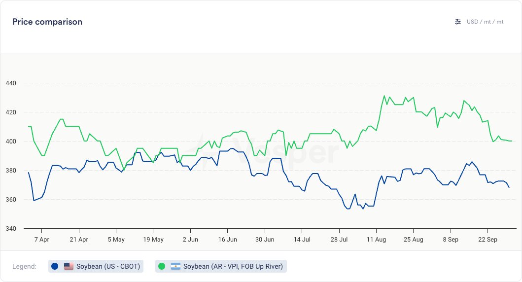 • انخفض سعر فوب الأرجنتين إلى 400 دولار أمريكي/طن من 404 دولارات أمريكية/طن في الفترة نفسها من الأسبوع الماضي