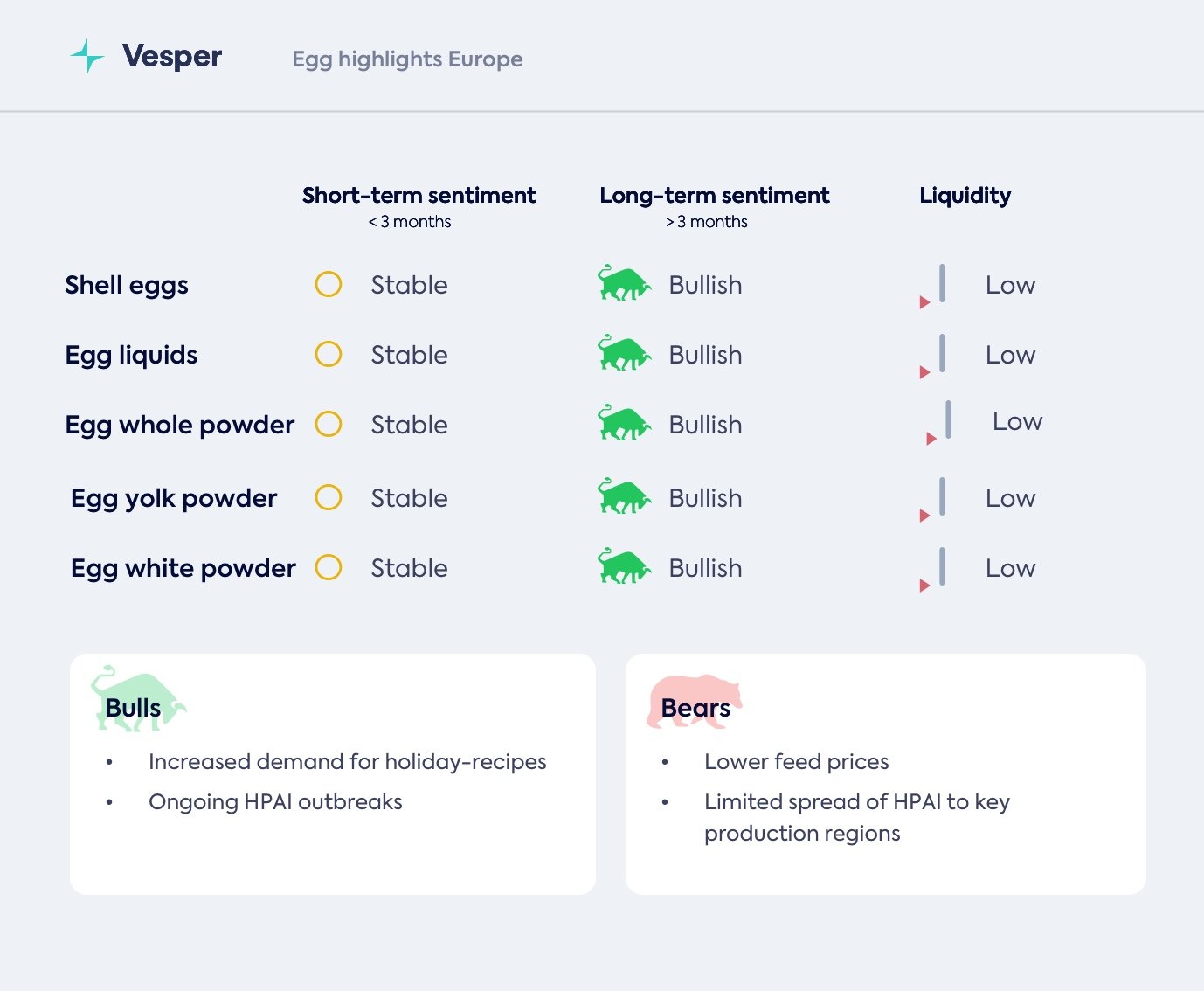 يبقى سوق البيض الأوروبي مستقرًا على الرغم من تفشي إنفلونزا الطيور المستمر. تحافظ ألمانيا على دورها كمركز للكشف عن الطيور البرية، في حين تظهر فرنسا وإيطاليا كنقاط ساخنة جديدة، مما يسلط الضوء على أن تدابير الاحتواء المبكرة لم تساعد في منع انتقال العدوى بفعالية كما كنا نأمل. بدأ الشعور السلبي للمزارعين المحليين تجاه واردات البيض المرتفعة من أوكرانيا يتبلور في سياسات جديدة، حيث كانت فرنسا أول من أعلن عن قيود تهدف إلى مساعدة السوق المحلية.