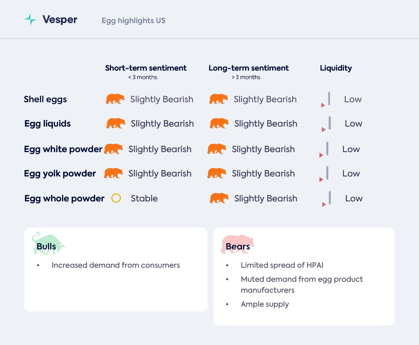 - لم يتم الإبلاغ عن أي تفشي جديد لإنفلونزا الطيور في الدجاج البياض أو الدواجن في الأسبوعين الماضيين، وهو تناقض حاد مع الموجات الشديدة التي شهدتها في الربع الرابع من العام الماضي والربع الأول من هذا العام. ومع ذلك، تستمر التقارير عن حالات في البط في تذكير المنتجين بالخطر الوشيك. كان الاحتواء أفضل بشكل ملحوظ؛ يعد تدخل وزارة الزراعة الأمريكية السابق من الربع الأول عاملاً محتملاً. تتحسن الثقة مع استقرار ضغط المرض مع اقتراب فصل الشتاء.