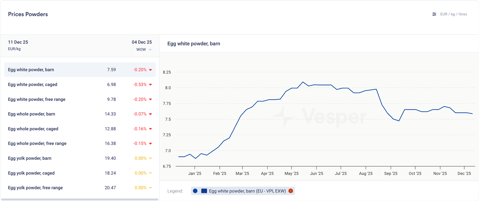 | مسحوق بياض البيض، حظائر | 0.20% ↓ | €7.6 | €7.58 |