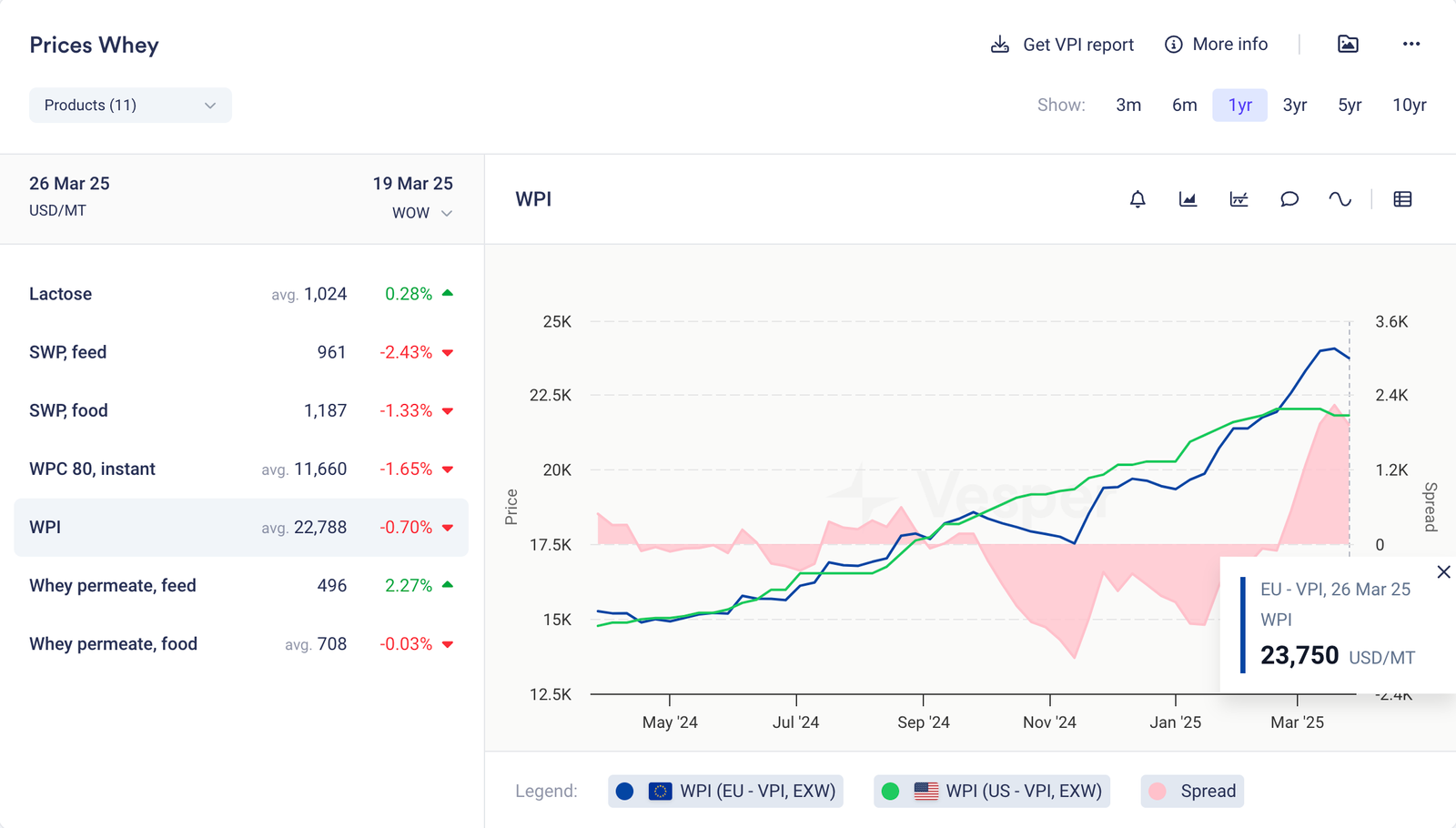 • لا تزال مراكز بروتين مصل اللبن الأعلى تسحب الكثير من مصل اللبن من تيار مصل اللبن الجاف نحو WPC و WPI، لكن هذا لم يؤد إلا إلى انخفاض بنسبة -1.92٪ في إنتاج مصل اللبن الجاف على أساس سنوي