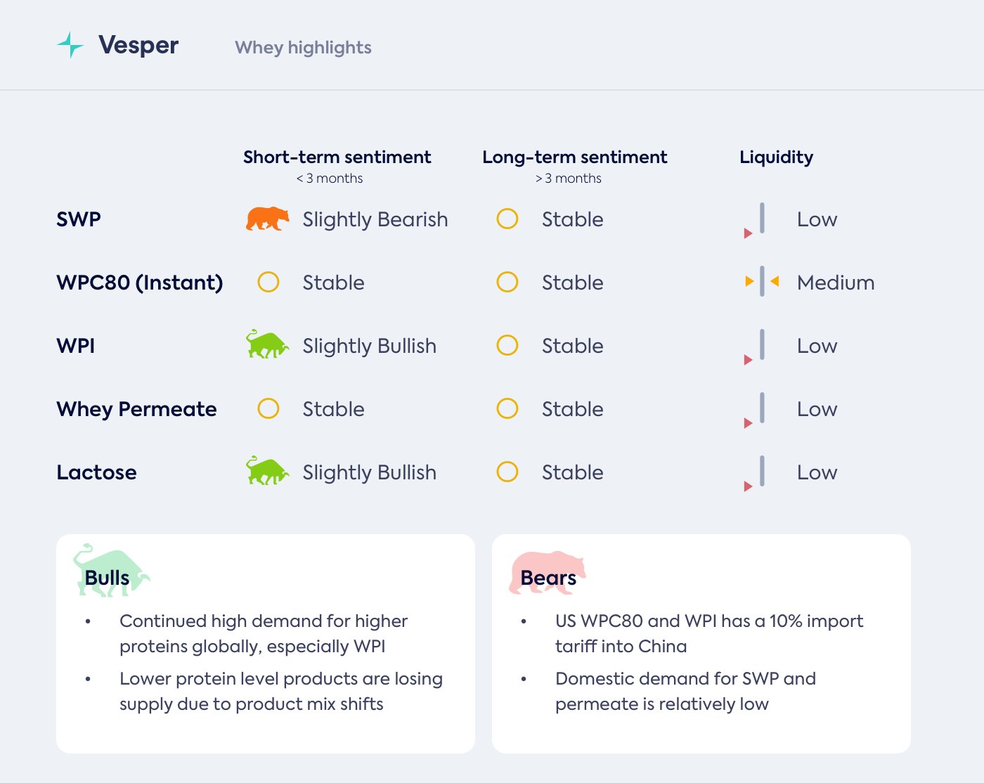 • الطلب على مسحوق مصل اللبن منخفض، في حين أن توافر مصل اللبن السائل يستمر في التحسن بسبب الإنتاج الموسمي الأعلى للحليب والجبن