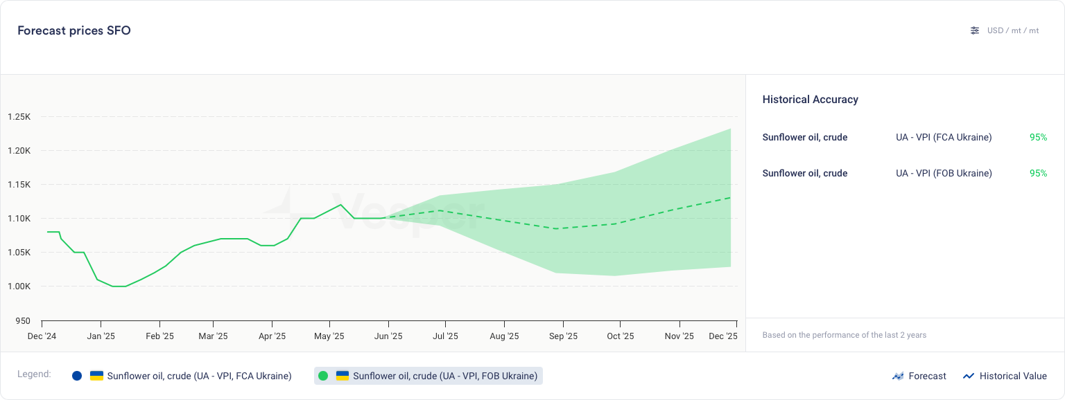 - ≈ 636 دولارًا أمريكيًا/طن متري بذور الشمس الأوكرانية (من 624 دولارًا أمريكيًا/طن متري) – عروض أسعار 25500–26600 UAH/t CPT، مع تقلبات أسعار الصرف التي تلطخ اتجاه UAH