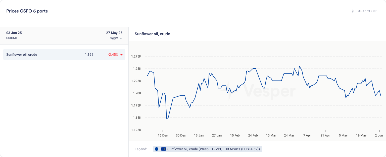 - تؤدي الزيوت المنافسة المتراجعة (النخيل، بذور اللفت، زيت الصويا) وضعف إنتاج الديزل الحيوي العالمي إلى إبقاء زيت الشمس تحت الضغط، مما يعوض الرياح الخلفية من الإنتاج المنخفض في الموسم الماضي.