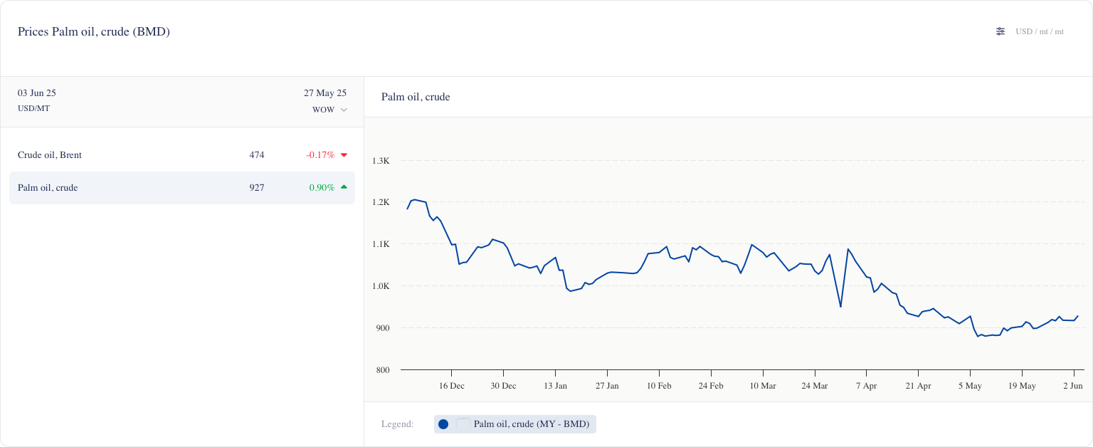 - أغلق مؤشر BMD CPO الفوري القياسي الأسبوع عند 917 دولارًا أمريكيًا/طن متري، ارتفاعًا من 912 دولارًا أمريكيًا/طن متري (+0.5% على أساس أسبوعي). ومع ذلك، استقرت العقود الآجلة القريبة لأغسطس 25 عند 3878 رينجيت ماليزي/طن متري، أي أقل بمقدار 54 رينجيت عن يوم الجمعة السابق، حيث امتد البيع في الجلسة المتأخرة في CBOT soyoil.