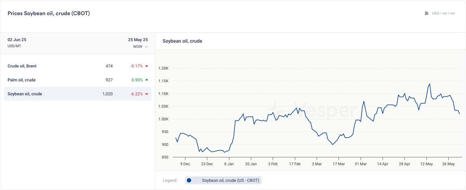 - لا تزال الرياح المعاكسة الكلية قائمة: انخفضت العقود الآجلة لخام برنت لشهر يوليو إلى 63.90 دولارًا أمريكيًا/برميل، مما أدى إلى انخفاض زيت الغاز وتقليل هوامش الديزل الحيوي، في حين أبقت اضطرابات التعريفات الجمركية أموال الصناديق حذرة.
