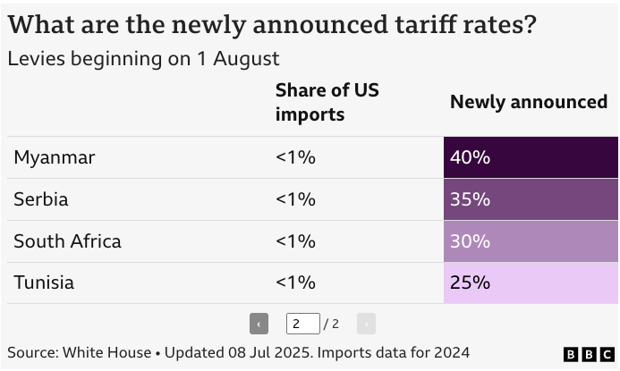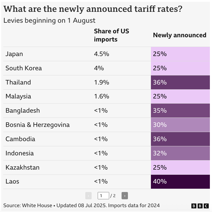 • حتى الآن، تم إخطار مجموعة معينة فقط من البلدان بشأن التعريفات (انظر أدناه). والجدير بالذكر أن إندونيسيا واليابان اشترتا معًا العام الماضي 3.6 مليون طن متري من فول الصويا الأمريكي