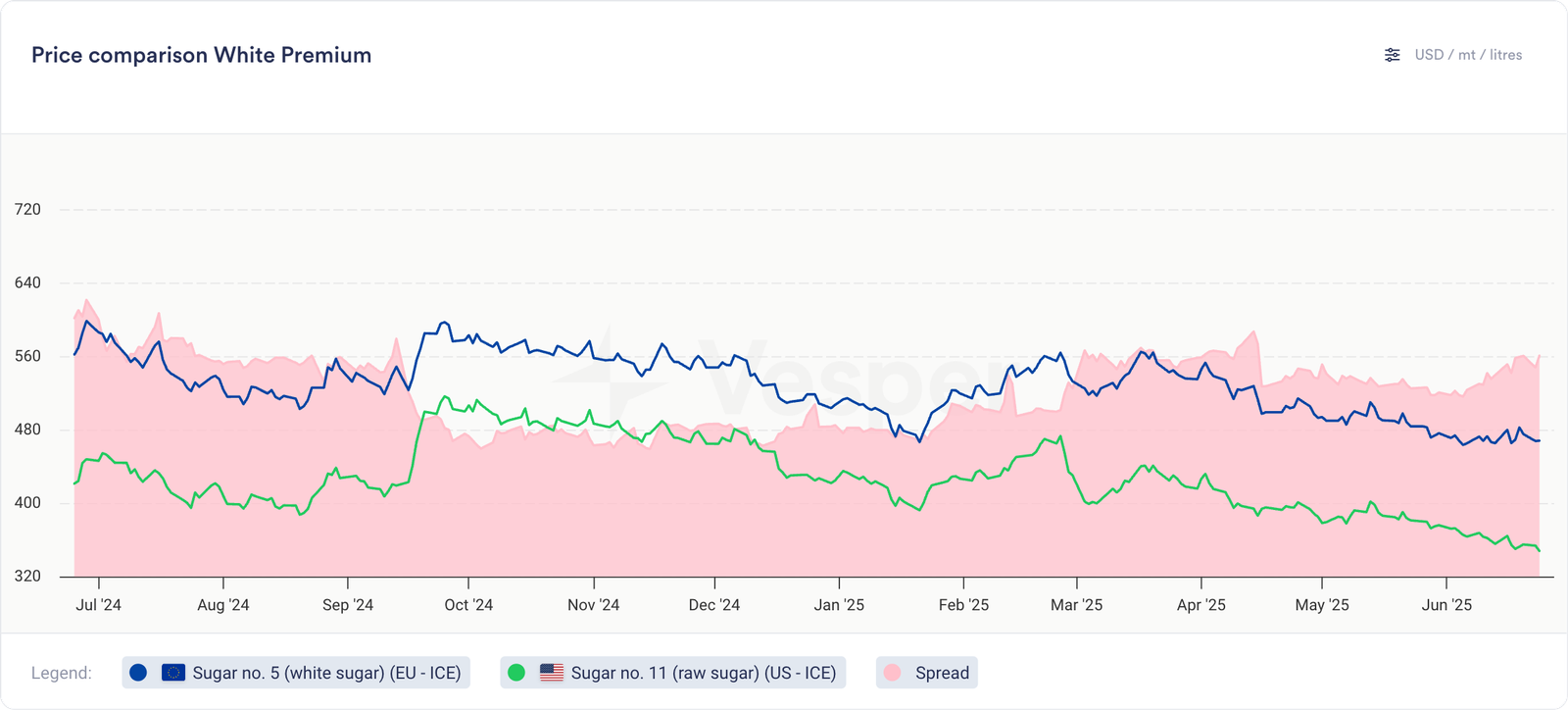 تواصلت عمليات انخفاض أسعار السكر الخام في نيويورك، حيث أغلقت عقود يوليو 2025 الآجلة عند 15.77 سنتًا أمريكيًا للرطل في 24 يوليو، بانخفاض 8.8% على أساس شهري و18.7% على أساس سنوي. لم تتمكن المكاسب القصيرة الأجل الناتجة عن واردات السكر الباكستانية المحتملة من تعويض المشاعر الهبوطية. يواجه المنتجون البرازيليون ضغوطًا إضافية بسبب قوة الريال البرازيلي مما يؤثر على الأسعار المحلية.