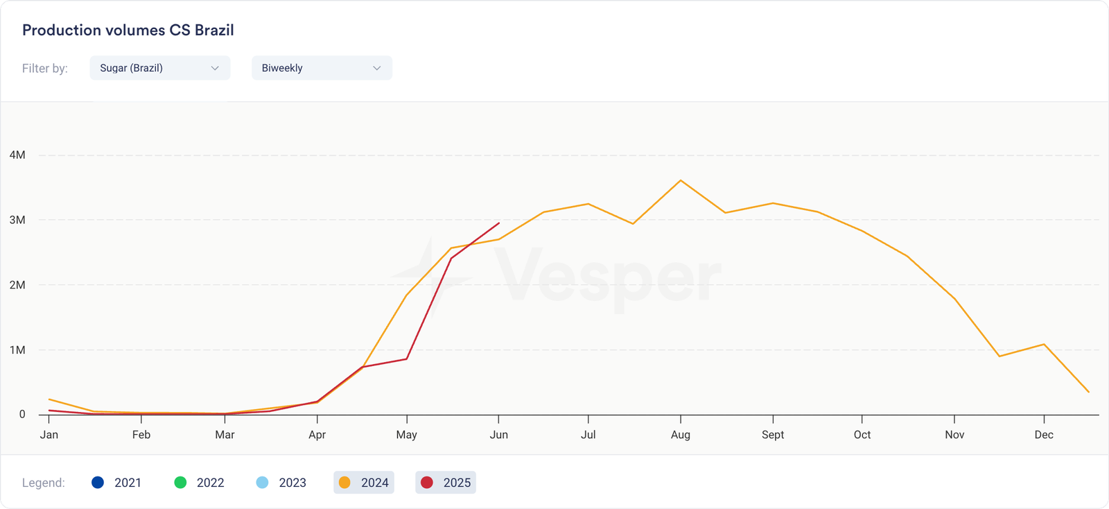 • وصلت إنتاجية القصب إلى 82.0 طن/هكتار في مايو، بانخفاض 10% على أساس سنوي. لا تزال الظروف الجوية الجافة مستمرة، لكن المصانع سرعت السحق في أواخر مايو؛