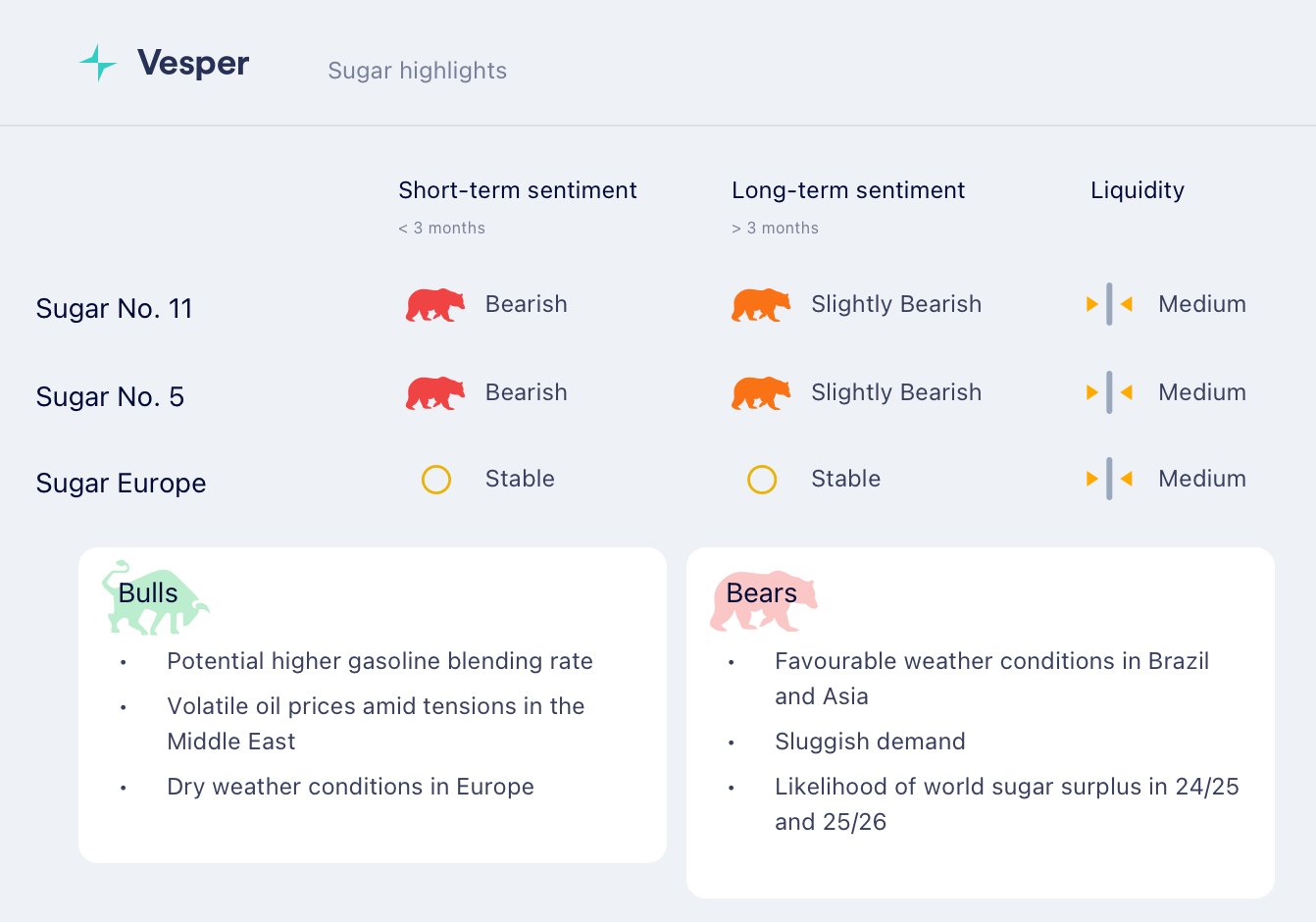 لا تزال النظرة قصيرة الأجل لوسط جنوب البرازيل هبوطية مع تسارع السحق وصادرات السكر، لكن الغلات الزراعية الضعيفة وانخفاض ATR لا يزالان يحدان من إمكانات الإنتاج الإجمالية. على المدى المتوسط إلى الطويل، يمكن أن يؤدي ضعف الأداء الميداني المستمر إلى تعطيل الإمدادات، حتى لو ساعدت تفويضات الخلط وزيادة إنتاج إيثانول الذرة في تحقيق التوازن بين الطلب على الإيثانول.