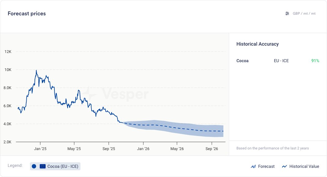 شوهدت التدابير المتخذة في المصدر وهي تزيد من توافر حبوب الكاكاو، في الوقت الحالي، كانت تدفقات الأخبار قصيرة الأجل هبوطية، مما سمح للأسعار بالانخفاض على أساس العقود الآجلة وكذلك في المصدر. تُظهر كل من عقود ICE Europe و US تراجعًا طفيفًا، يركز على تحسينات الإمدادات لعام 2025/26، مع استطلاع رأي لـ Bloomberg للصناعة يقدر الفائض بـ 186,000 طن، أي ثلاثة أضعاف فائض موسم 2024/25. في الأسواق الخارجية، أظهرت نتائج استطلاع حديث لمديري الصناديق العالميين أكثر المشاعر تفاؤلاً منذ فبراير من هذا العام، بينما يعتقد المستثمرون أن أسواق الأسهم مبالغ فيها، شجع الارتفاع في التفاؤل بشأن الاقتصاد الأوسع نطاقًا تدفقات الاستثمار على الاستمرار. شوهدت التخصيصات للسلع وهي تزداد مع ارتفاع الإقبال على المخاطرة بشكل عام مع استمرار الاهتمام في المقام الأول بالمعادن الثمينة مع ارتفاع أسعار الذهب إلى مستويات قياسية مرتفعة بنسبة 60% على مدار عام 2025 وارتفاع الفضة الآن بنسبة 80% هذا العام. لا يزال مسار عدم اليقين في السياسة الأمريكية واضحًا في مخاطر الدولار الأمريكي، مما ساهم في الاهتمام الكبير بالذهب. قد تؤثر قيم الدولار الأمريكي الضعيفة على تسعير الكاكاو عبر سعر اليورو/الدولار الأمريكي والذي من المتوقع أن يتحرك إلى 1.20 في الأشهر القليلة المقبلة، من المستويات الحالية البالغة 1.16.
