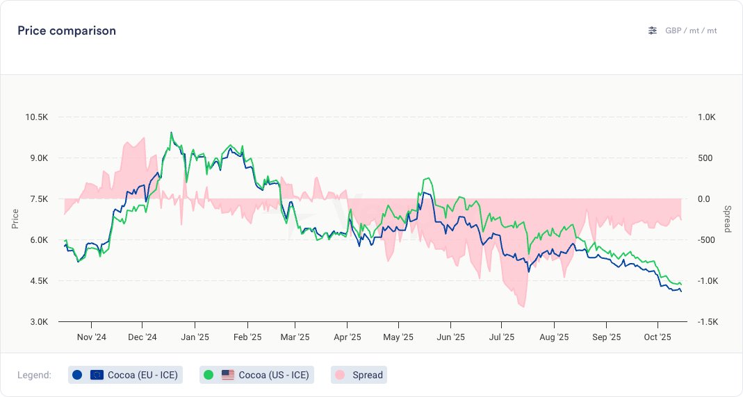 انخفضت أسعار الكاكاو بنسبة 20% خلال الشهر الماضي (على أساس الشهر الأول في بورصة ICE EU)، حيث لا تزال التوقعات بشأن المحصول الرئيسي في غرب إفريقيا في الفترة من أكتوبر إلى مارس متفائلة. كانت الظروف الجوية داعمة بشكل عام للإنتاج الذي يتحسن مقارنة بالموسم الماضي. في هذا السياق، قررت الصناديق تمديد مراكزها القصيرة في عقود الكاكاو الآجلة الأوروبية في بورصة ICE الأسبوع الماضي. أدى إغلاق الحكومة الأمريكية إلى خلق فجوة في البيانات على الجانب الآخر من المحيط الأطلسي، ولكن بالنظر إلى تحركات الأسعار، فمن المحتمل أنه من الآمن افتراض أن الصناديق لديها أيضًا مراكز قصيرة في عقود الكاكاو الآجلة الأمريكية. يصبح من المغري أن نتساءل عما إذا كان السوق قد دخل الآن منطقة البيع المفرط، بعد عام من الارتفاع المذهل. انخفضت مخزونات الكاكاو الأمريكية إلى أدنى مستوياتها منذ ما يقرب من 6 أشهر، ولا تزال هناك بعض الآثار المتبقية من الحقبة الأخيرة من ضيق الإمدادات والتي ستستغرق بعض الوقت لإعادة البناء، مما يشير أيضًا إلى أنه لا ينبغي لنا أن نكون متفائلين بشكل مفرط بشأن المزيد من الانخفاضات.