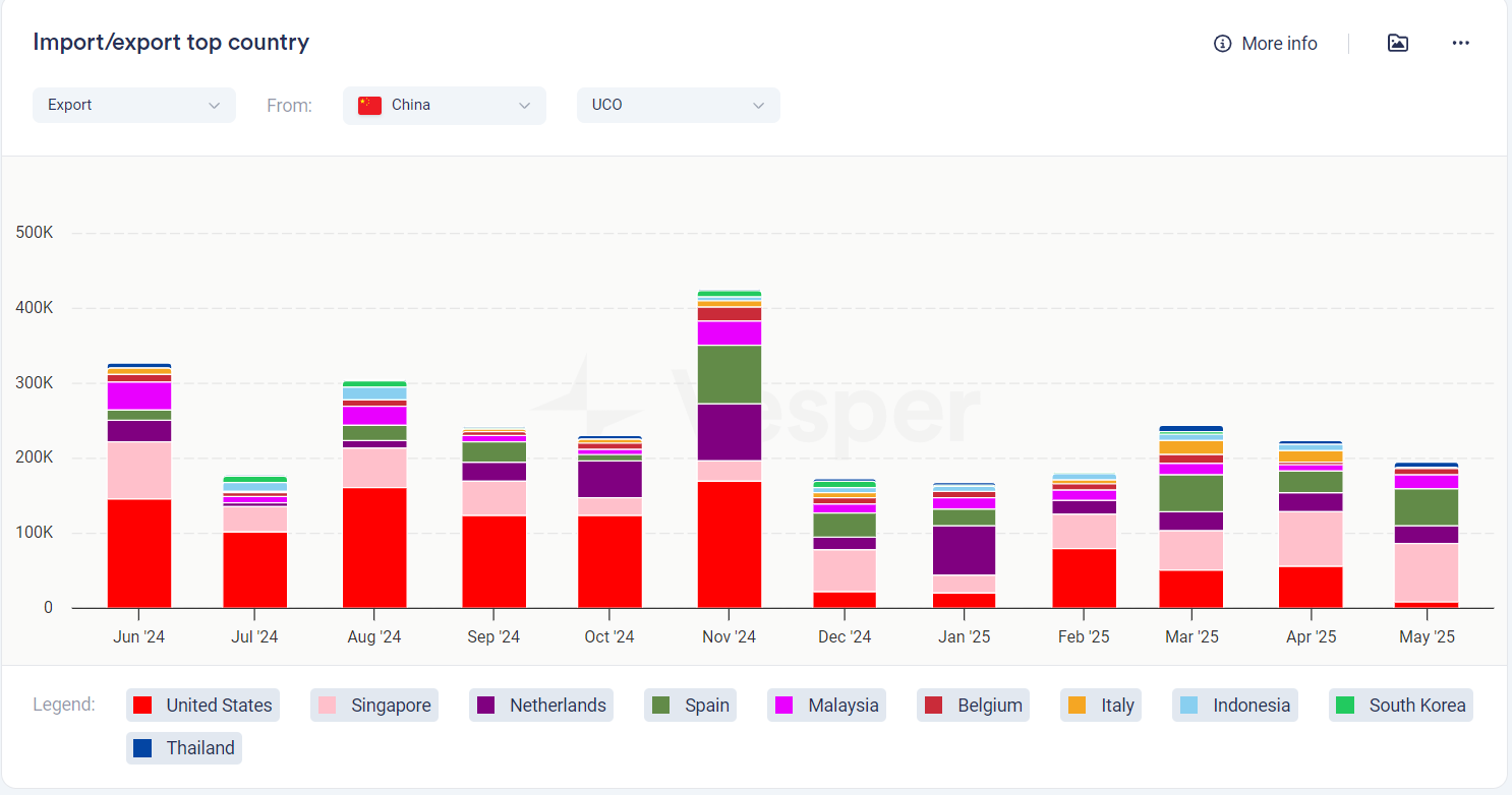 • وصلت صادرات UCO الصينية إلى 192,402 طن متري في مايو، بانخفاض عن 326,000 طن متري في مايو من العام الماضي. لم يتم شحن أي أحجام إلى الولايات المتحدة؛ ذهب معظمها إلى سنغافورة وأوروبا