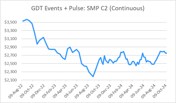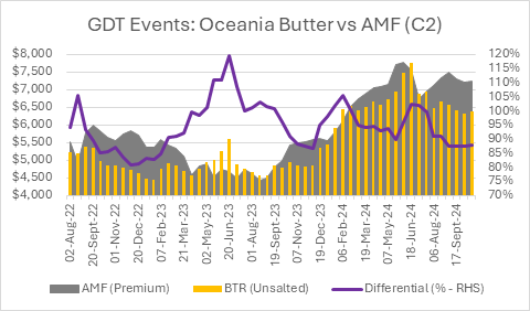 استقرت AMF Premium C2 (7,255 دولارًا) إلى حد ما في هذا المزاد بعد انخفاضها بمقدار 275 دولارًا / 3.7٪ منذ 3 سبتمبر. استقر C1 (7,610 دولارات) بعلاوة رائعة على C2 (355 دولارًا / 4.9٪) وعلى أعلى مستوى منذ 20 أغسطس. تداول المنحنى الآجل في التراجع، ومع ذلك، مع تداول C6 بخصم 105 دولارات / 1.4٪ على C2. تشير هيكل المدة في مزاد اليوم إلى وجود بعض الضيق على المدى القصير لهذا المنتج، ولكن الناس سعداء نسبيًا بعدم الدفع مقابل عمليات التسليم في المستقبل.