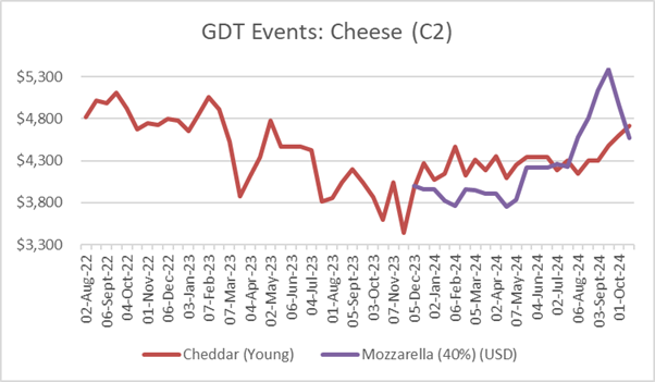 انخفض مزاد GDT Events اليوم بنسبة 0.3٪ عبر جميع المنتجات والمواصفات وفترات العقود. أنهى WMP تعاملاته بشكل ثابت، وبينما أنهى Cheddar (+4.2٪) و AMF (+0.3٪) التعاملات بشكل إيجابي، فقد تمت موازنتها بنتائج أضعف في Butter (-0.3٪) و SMP (-1.8٪) واللاكتوز (-5.5٪)، وطباعة موزاريلا ضعيفة بشكل مثير للإعجاب (-8.2٪). بعد كل ما قيل، فإن النتيجة الثابتة عند مستويات أسعار مرتفعة تاريخيًا هي نتيجة قوية خلال فترة الذروة.